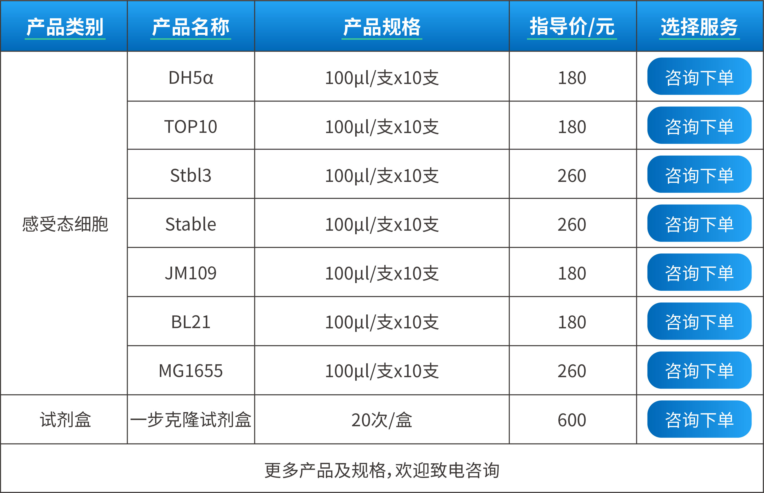 感受態(tài)細(xì)胞是通過(guò)理化方法誘導(dǎo)的細(xì)胞,使其進(jìn)入一個(gè)最佳的生理狀態(tài),以便攝取和整合外來(lái)DNA。具體來(lái)說(shuō),這是指在某些生長(zhǎng)階段的細(xì)菌細(xì)胞,無(wú)論是自然還是經(jīng)過(guò)人工處理,都能夠攝取外源DNA,并因此改變其基因型和表現(xiàn)型。麗山生物可提供多種感受態(tài)細(xì)胞產(chǎn)品,包括大腸桿菌DH5α感受態(tài)細(xì)胞、大腸桿菌JM109感受態(tài)細(xì)胞、大腸桿菌Top10感受態(tài)細(xì)胞、大腸桿菌BL21感受態(tài)細(xì)胞、大腸桿菌stbl3感受態(tài)細(xì)胞等。